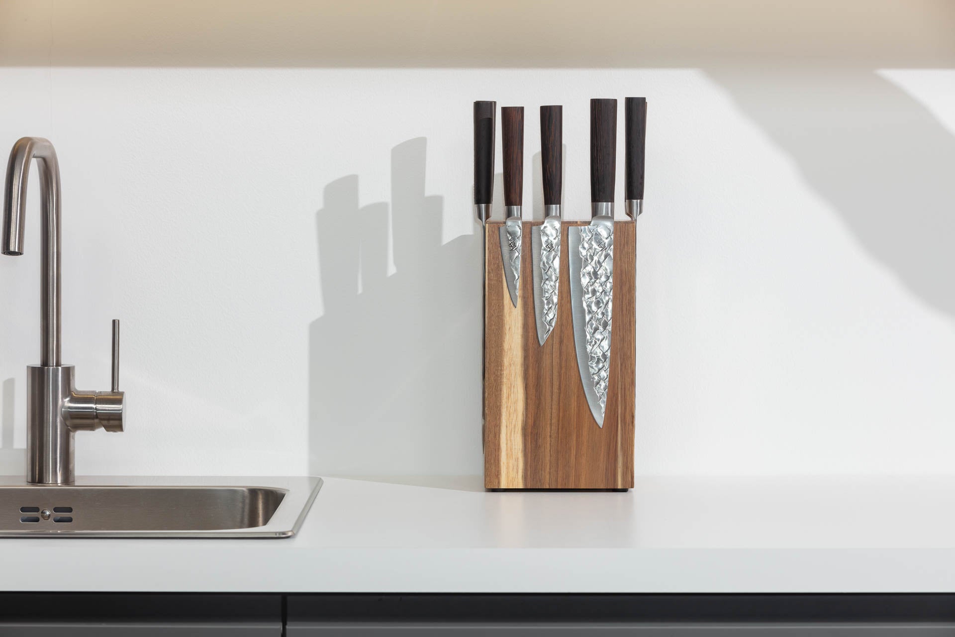 Het tijdloze ontwerp zorgt voor eenvoudig en veilig opbergen. Het beschikt over voldoende oppervlakte voor al je messen en heeft een houten afwerking die de sfeer van elke keukenruimte naar een hoger niveau tilt.